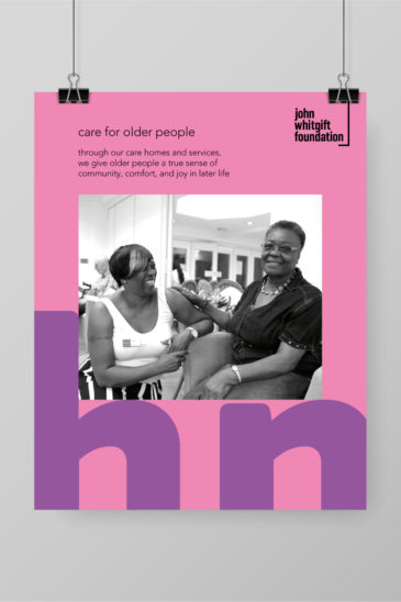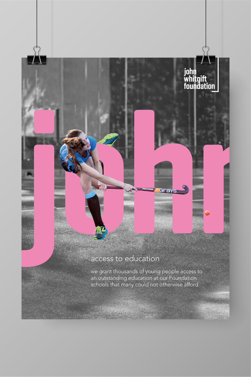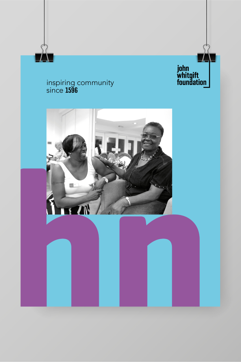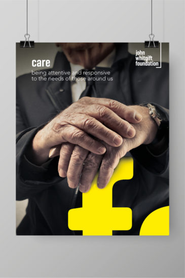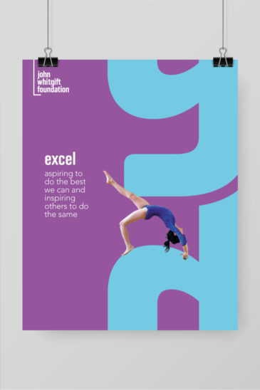 The posters reinforce the John Whitgift Foundation’s founding vision, mission, and their three core values: to ‘serve’, ‘care’ and ‘excel’. The bright, colourful, energetic brand that we created, utilises various graphic tools and a visual language that acts in a supporting role. From the keyline graphic that underpins the logotype, to the use of large typographic elements which are details taken directly from the logo, they all help reflect the overarching message of ‘supporting the community’.