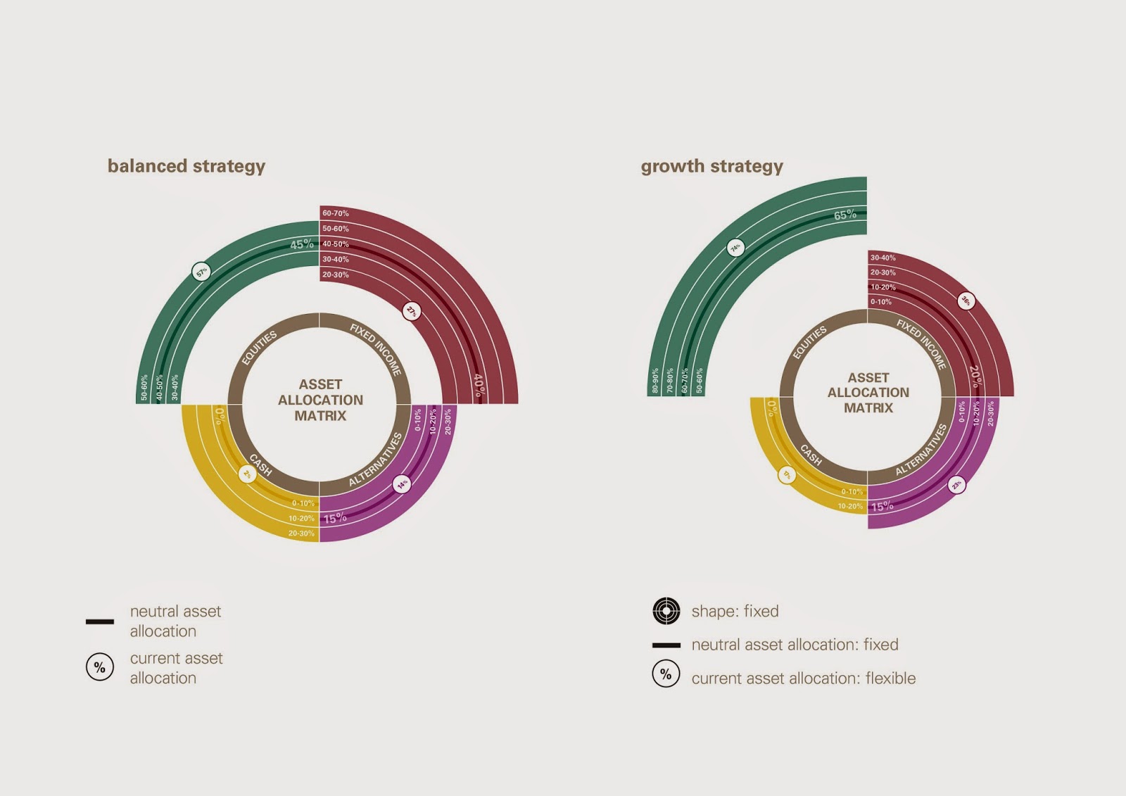 Following on from the investment theme icons, we created new chart styles to represent strategic and tactical information to convey the core investment approach of EFGAM. Using changes in colour and shape we were also able to communicate a large amount of information simply (and stylishly might we add!), to quickly allow the inhouse team and clients to interpret the content and difference in information so that they could evaluate and choose their approach more easily.